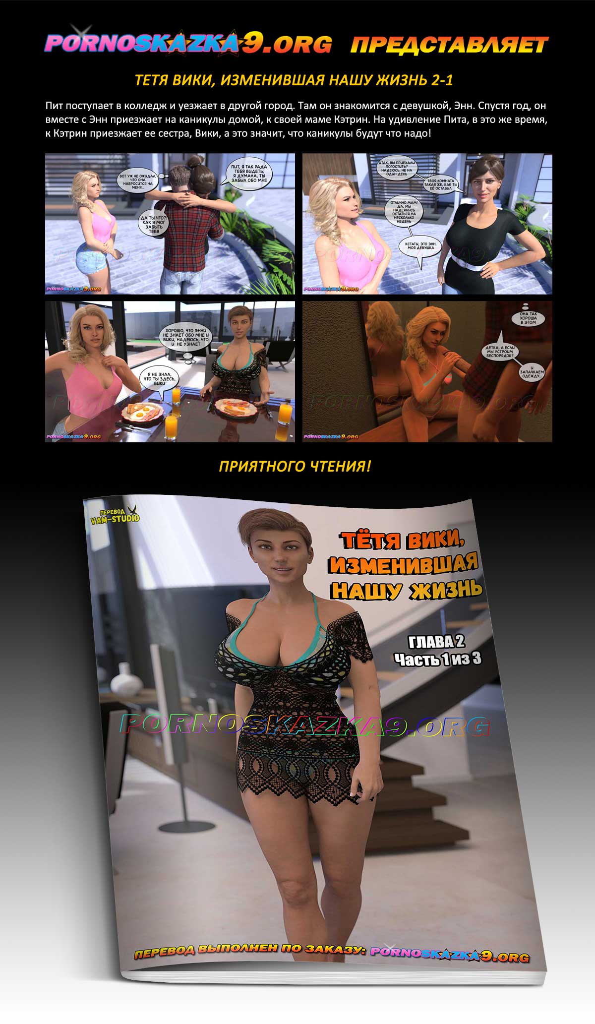 Порно комикс «Тетя Вики, изменившая нашу жизнь. Глава 2. Часть 1 из 3.» Пит поступает в колледж и уезжает в другой город. Там он знакомится с девушкой, Энн. Спустя год, он вместе с Энн приезжает на каникулы домой, к своей маме Кэтрин. На удивление Пита, в это же время, к Кэтрин приезжает ее сестра, Вики, а это значит, что каникулы будут что надо!